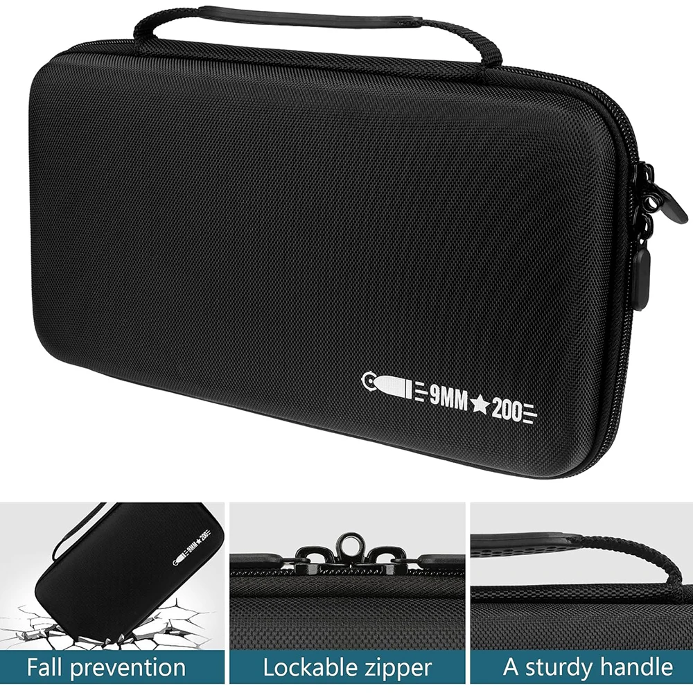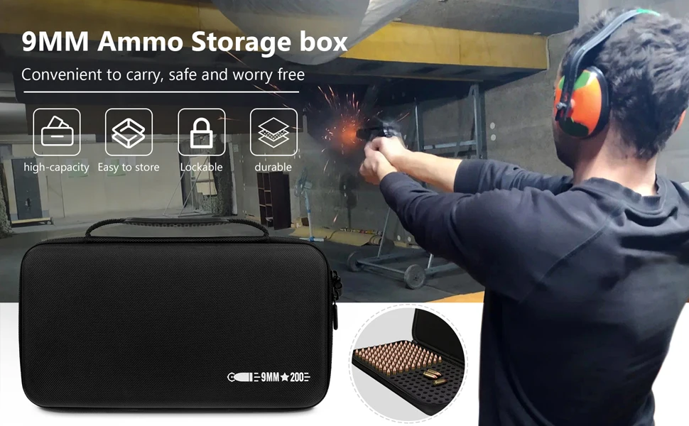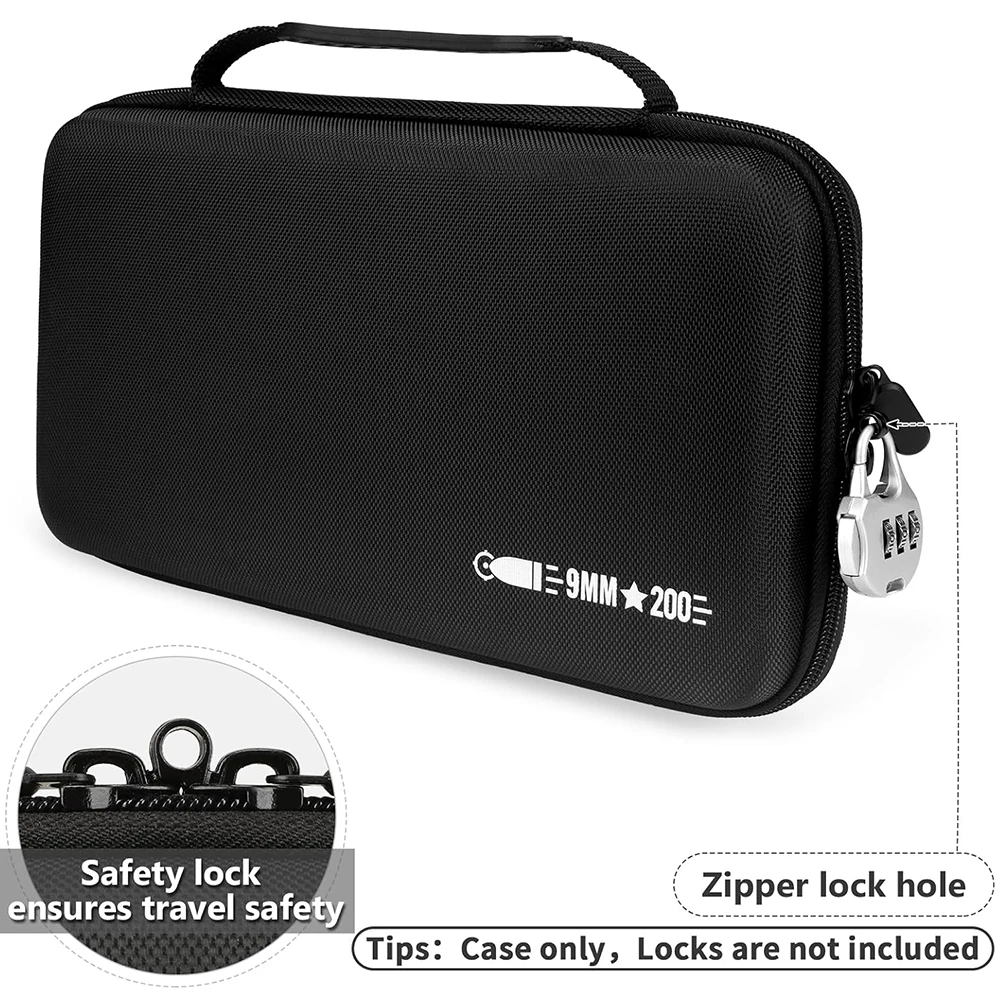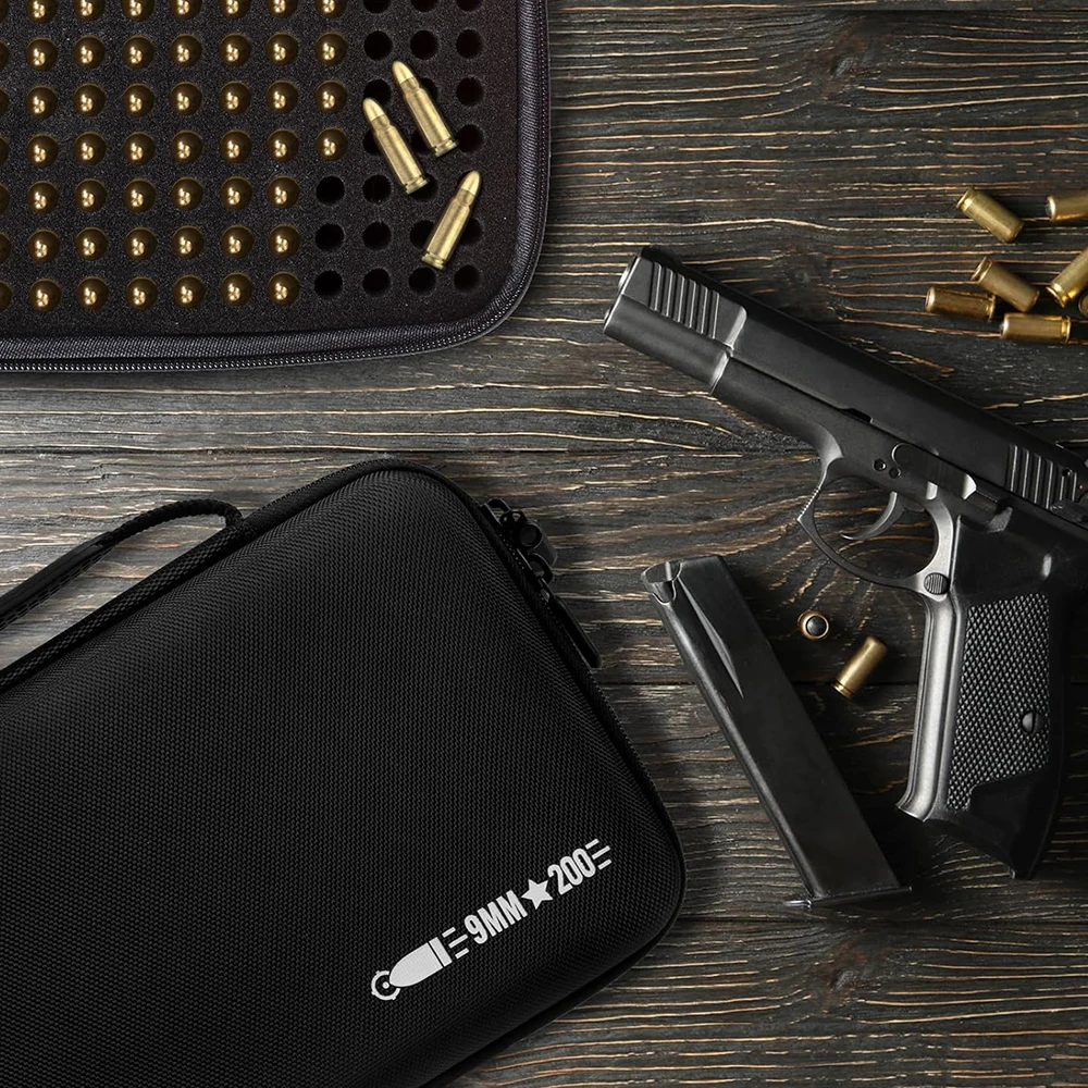 This lockable 9mm ammo storage case securely holds up to 200 rounds, accommodating 9mm Luger, 9mm Parabellum, 9mm Makaro, 45 ACP, 380 ACP, 32 ACP, 30 Luger, 32 S&W, and 40 S&W cartridges. Constructed from durable EVA material with soft padding, it protects ammunition from impact and dust while preventing movement during transport. Its lockable design ensures your rounds remain safe from unauthorized access. Compact and portable, measuring 31 x 17 x 6 cm (12.2 x 6.7 x 2.36 inches), it includes a sturdy handle ideal for range trips, outdoor use, and secure storage.